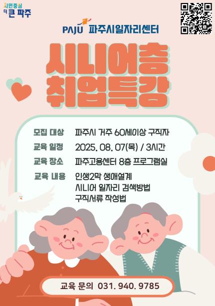 이번 특강은 퇴직 이후 제2의 행복을 준비하는 장년층을 지원하기 위해 마련된 것으로, 파주시 거주 만 60세 이상 구직자를 대상으로 운영된다.