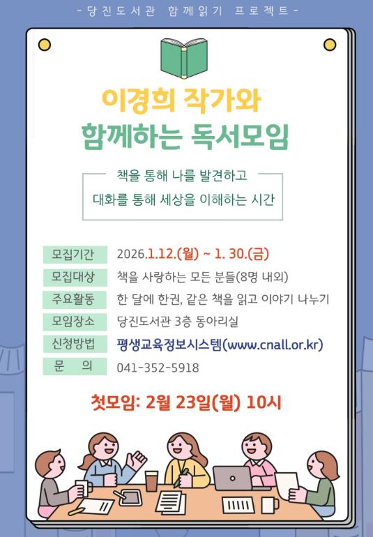 당진도서관 관계자는 “이번 독서모임이 지역 작가와 주민이 문학을 매개로 깊이 있게 소통하는 계기가 되길 기대한다.”며“꾸준한 독서와 사유의 시간을 갖고 싶은 지역 주민들의 많은 관심과 참여를 바란다”고 전했다.