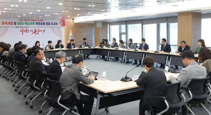 이날 보고회에는 박희조 동구청장을 비롯해 국·소장과 부서장 등 33명이 참석했으며, 민선 8기 공약사업과 핵심과제 전반의 추진 현황을 점검하고 남은 과제의 이행을 위한 추진 방향을 공유했다.
