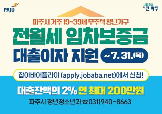 청년 전월세 임차보증금 대출이자 지원은 파주시에 주민등록을 둔 무주택 가구 중 제1금융권에서 전월세보증금 대출을 받은 19~39세(1985년 6월 27일~2006년 6월 26일 출생) 청년에게 대출잔액의 2% 이자를 반기별 최대 100만 원씩 총 2회(연 최대 200만 원) 지급하는 사업으로 하반기 10가구를 선정할 예정이다.