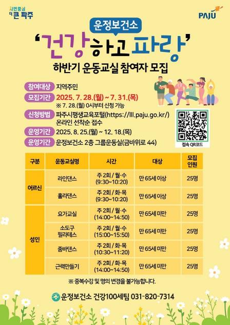 참여 신청은 오는 28일 0시부터 파주시 평생교육포털을 통해 가능하며, 프로그램과 관련된 사항은 파주 운정보건소 건강100세팀으로 문의하면 된다.