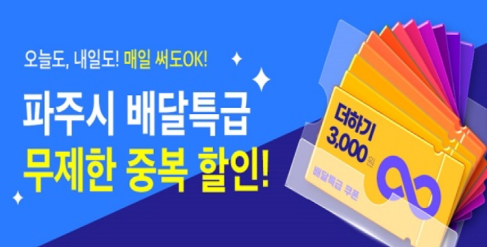 현재 파주시에 있는 3천여 개 배달특급 가맹점에서 1만 8천 원 이상 주문 시 1회당 3,000원 할인권을 예산 소진 시까지 횟수 제한 없이 사용할 수 있다. 또 배달특급 내 업체가 지역화폐 가맹점인 경우 할인권 혜택과 더불어 파주페이 10% 추가 특전(인센티브) 혜택까지 동시에 받을 수 있다.