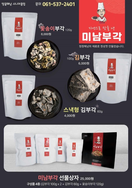 기획전 주요 생산품은 ▲여수시니어클럽 김치류 ▲순천시니어클럽 손질멸치·누룽지세트 ▲고흥시니어클럽 참깨 누룽지 ▲보성시니어클럽 녹차 기름 세트 ▲완도시니어클럽 김·유자사과 주스 세트 등이다.