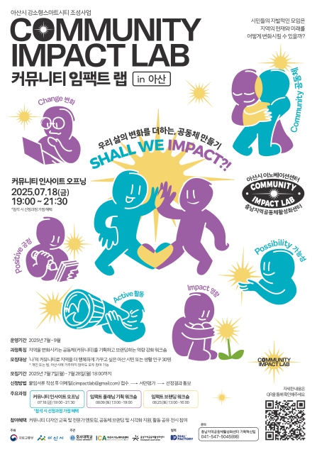 '커뮤니티 임팩트 랩 in 아산'은 아산 시민과 생활 인구가 각자의 커뮤니티를 기반으로 지역문제를 실험적으로 해결하며 지역의 변화를 만들어가는 실천형 워크숍 프로그램이다.