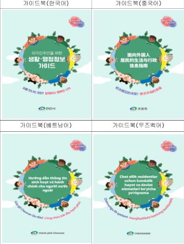 가이드북에는 ▲천안시 소개 ▲외국인주민 및 다문화가족 지원사업 ▲생활폐기물 배출 방법, 취득세 등 생활정보 ▲외국인주민 의료지원 ▲외국인등록 및 체류 ▲관련 기관 안내 등이 담겼다.