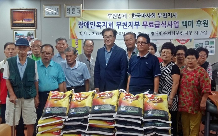 이날 백미를 후원받은 장애인복지회 부천지부 김중덕 어르신은 "지역 장애인들을 위해 장애인복지회에서 매일 운영하는 무료급식사업에 도움을 줘 고맙다"며 "우리도 지역 어른으로서의 역할을 잊지 않고 솔선하겠다"고 고마움을 밝혔다.