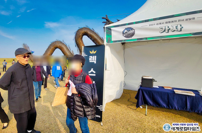 ▲2021년 11월 3일 김제 벽골제 쌍용광장 특설 전시장에서 ‘김제시 2차 중소기업 수출전시상담회’가 진행되는 가운데 도올 김용옥 교수가 한 부스를 바라보고 있다.(세계로컬타임즈 DB) |