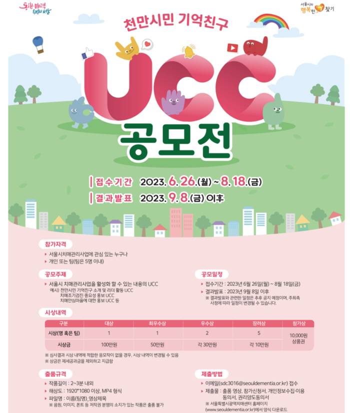 공모 주제는 ▴천만시민 기억친구 프로젝트 홍보 ▴기억친구, 기억친구리더 활동 소개 ▴서울시 치매관리사업(치매조기검진 중요성, 치매안심마을 등)을 활성화할 수 있는 내용이다. 영상은 광고, 영상 일기(V-log), 정보 그림(인포그래픽), 만화 영화(애니메이션), 드라마 등 다양한 형태로 2~3분 이내로 제작하면 된다.