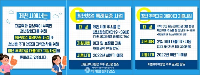 [세계로컬타임즈 김병호 기자] 제천시는 제천시에 주소를 둔 만19세 이상 39세 이하 청년들을 대상으로, ‘청년창업 특례보증 지원사업’과 ‘청년 주택자금 이자지원 사업’을 올해 하반기 추진할 예정이다.