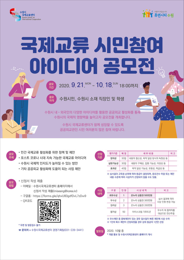 수원시민이면 누구나 참여할 수 있으며, 오는 10월 18일 마감한다. 심사 결과는 10월 중 수원시국제교류센터 홈페이지에 발표한다.