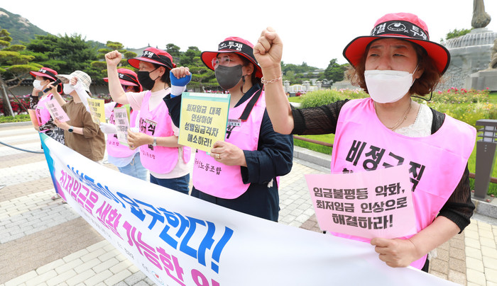 | ▲지난 7월 2일 오전 서울 종로구 청와대 분수대 앞에서 '최저임금을 생활가능한 임금으로!' 구호를 외치고 있는 모습. (사진=뉴시스) |