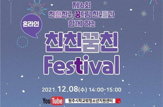 [세계로컬타임즈 김재민 기자] 원주시 학교밖청소년지원센터는 학교 밖 청소년들의 축제인 ‘제6회 친친 꿈친 페스티벌’을 오는 8일 오후 2시부터 유튜브를 통해 실시간 라이브 방송으로 개최한다.