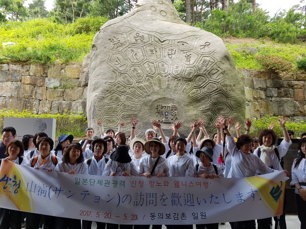 | ▲ 경남 산청 동의보감촌을 방문한 일본인 관광객들이 현수막을 펼친후 기념촬영하고 있다.<사진제공=산청군청> |