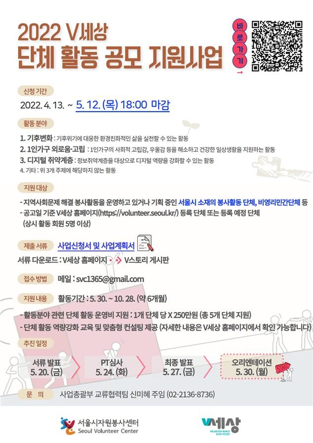 모집대상은 서울시 소재 봉사활동 단체, 비영리민간단체 등이며, 자원봉사 온라인플랫폼 ‘V세상’ 등록 단체 또는 등록 예정인 단체가 가능하며 상시 활동 회원이 5명 이상이어야 한다.
