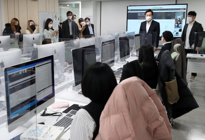 | ▲ 오세훈 서울시장이 서울 영등포구 청년취업사관학교 영등포 캠퍼스에서 수강생들과 만나고 있다. (사진=서울시) |