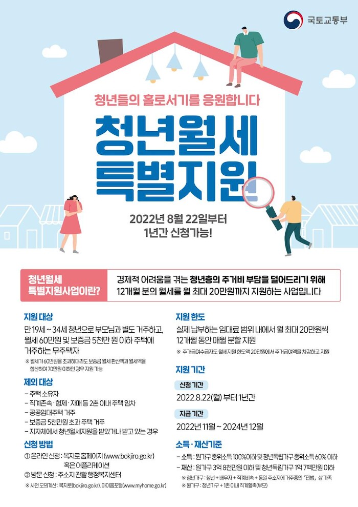 신청은 이달 22일부터 2023년 8월21일까지 1년간 할 수 있고, 월세 지원은 자격 심사 후 올해 11월부터 시작될 예정이다.
