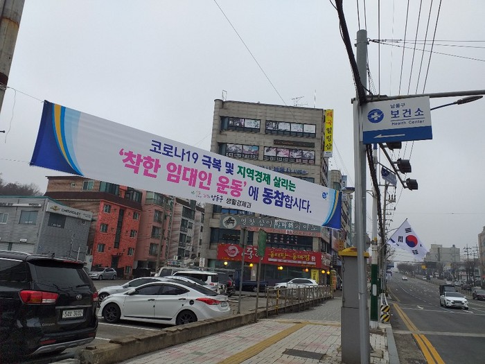 | ▲ 남동구 지역에 착한 임대인 운동에 동참하자는 현수막이 게시돼 있다. (사진=남동구 제공) |