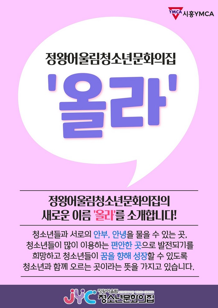 [세계로컬타임즈 장선영 기자] 시흥시는 지역 청소년들의 다양한 체험과 문화 활동을 지원하는 정왕어울림청소년문화의집에서 진행한 네이밍 공모전에서 ‘올라’가 최우수상을 받았다.