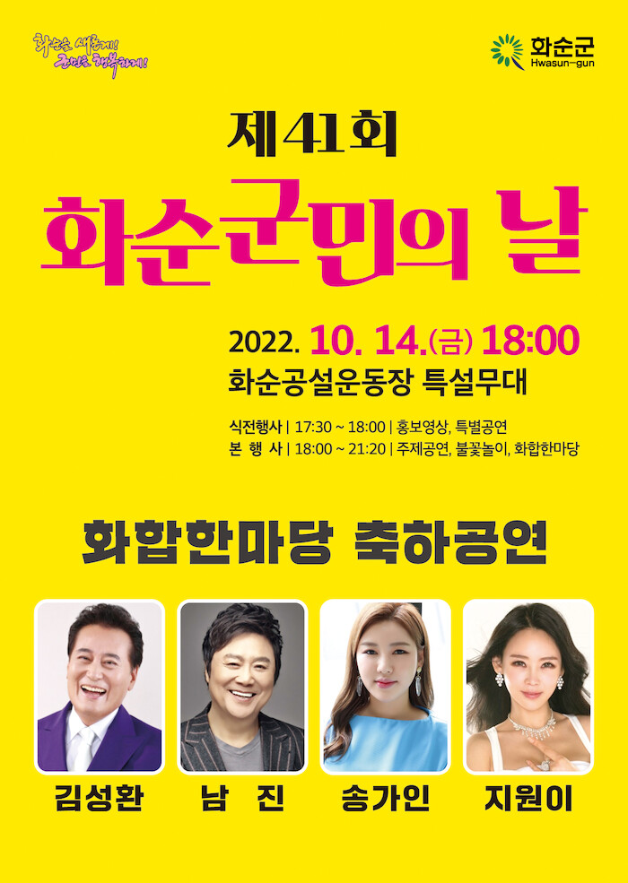 [세계로컬타임즈 강석운 기자] 화순군(군수 구복규)은 오는 14일 화순공설운동장 특설무대에서 펼쳐지는 제41회 화순군민의 날 행사 무대를 군민에게 큰 즐거움을 주는 공연으로 준비했다고 밝혔다.