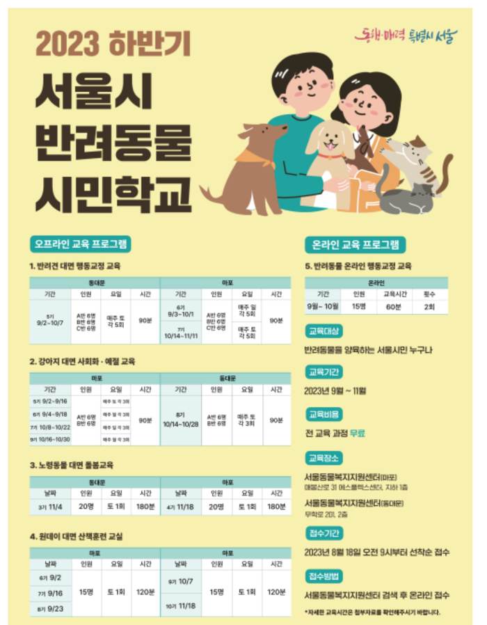 이에 어린 반려견의 사회화·예절 교육부터 산책, 문제행동 교정, 노령동물 돌봄교육까지 반려동물 생애주기별 맞춤교육을 받을 수 있는 ‘서울 반려동물 시민학교’ 하반기 강좌를 진행한다.