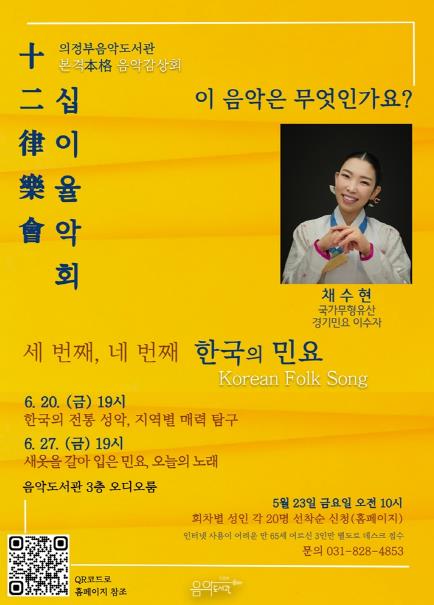 한국의 전통 성악곡인 민요를 해설과 함께 감상하고 싶은 성인은 누구나 5월 23일 오전 10시부터 의정부음악도서관 누리집을 통해 신청할 수 있다. 접수는 선착순이다.