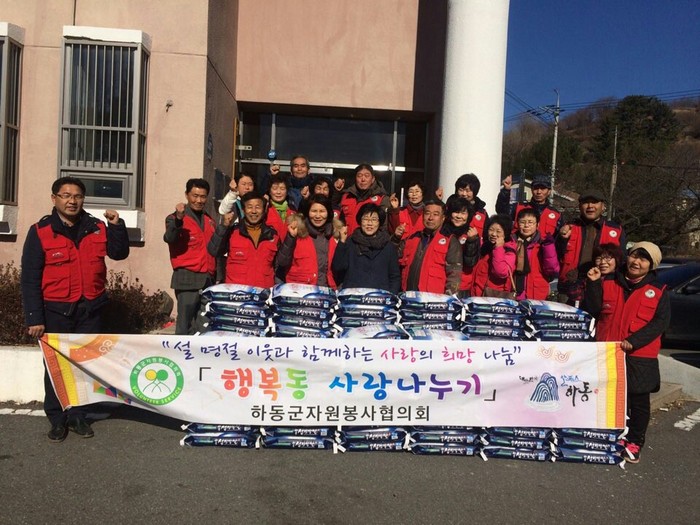 25일 경남 하동군에 따르면 하동군자원봉사협의회(회장 정종수)는 지난 24일 13개 읍·면의 소외계층에 10㎏들이 청결미 150포를 전달하는 ‘행복동 사랑나누기 행사’를 열었다.