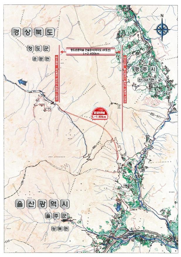 30일 경북도에 따르면 경북 청도군 운문면 신원리에서 울산광역시 울주군 상북면 덕현리로 이어지는 국가지원지방도 69호선 총연장 2.4km 구간(터널 연장 1,930m, 폭 9.5m)이 오는 31일 0시를 기해 전면 개통된다.
