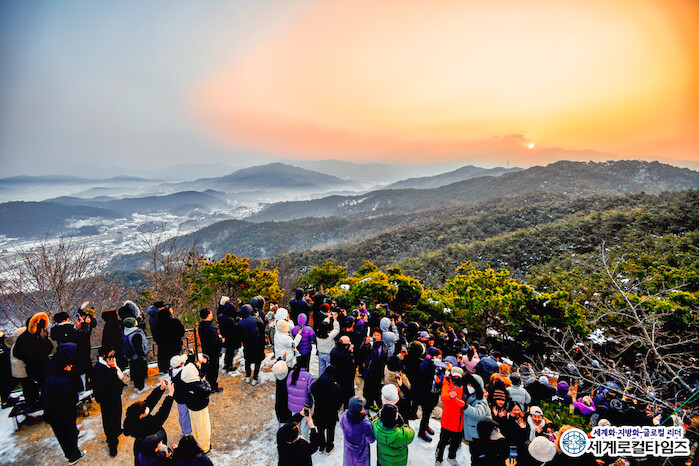 [세계로컬타임즈 조주연 기자] 2023년 계묘년 새해 첫날 전북 남원시 덕음산 팔각정에서 해맞이 행사가 진행된 가운데 시민들이 떠오르는 새해 첫 해를 맞이 하고 있다.