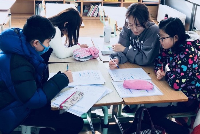 | ▲ 신흥초등학교 학생들이 산생님과 함께 특별보충학습을 진행하는 모습. |