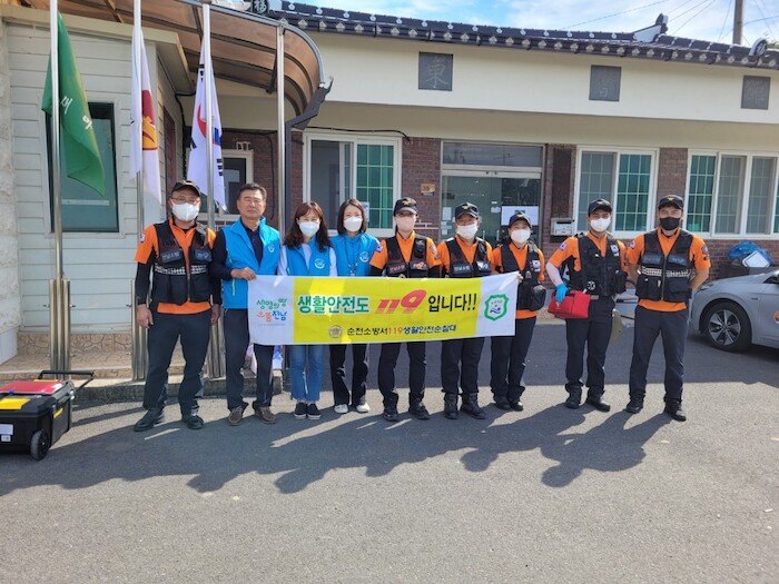 | ▲순천소방서 119안전순찰대 승주읍 복지기동대 협업 봉사활동(사진=순천소방서) |