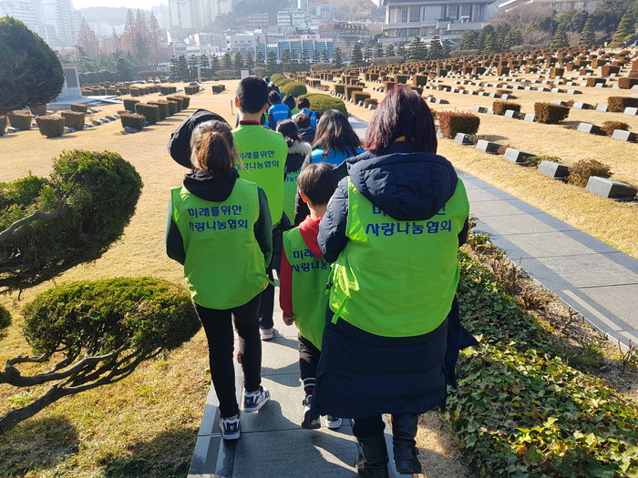 | ▲부산 한국전쟁 UN 전쟁참전국 용사들의 묘역을 미래위한 사랑나눔협회와 대전봉사체험교실 회원들이 엄숙하게 돌아보고있다 (사진=미사협) |