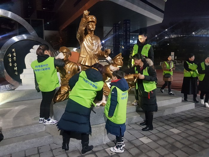 | ▲ 지난 22일 미사협 탈북민청소년들과 부모들이 대전 동광장역에 세워진 호국철도인 동상을 찾아 먼지를 닦으며 지킴이관리 봉사를 하고 있다. (사진제공=미사협) |