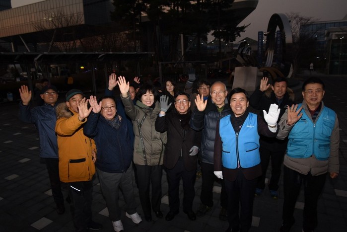 | ▲첫 번째 방문지인 부산 유엔기념공원으로 출발하는 회원들을 격려하기위해 강윤진 대전지방보훈청장, 권율정 국립대전현충원장, 황인호 동구청장, 전병두 동부교육지원청교육장 등이 이른새벽에 배웅을 하며 손을 흔들고있다. (사진=미사협 제공) |