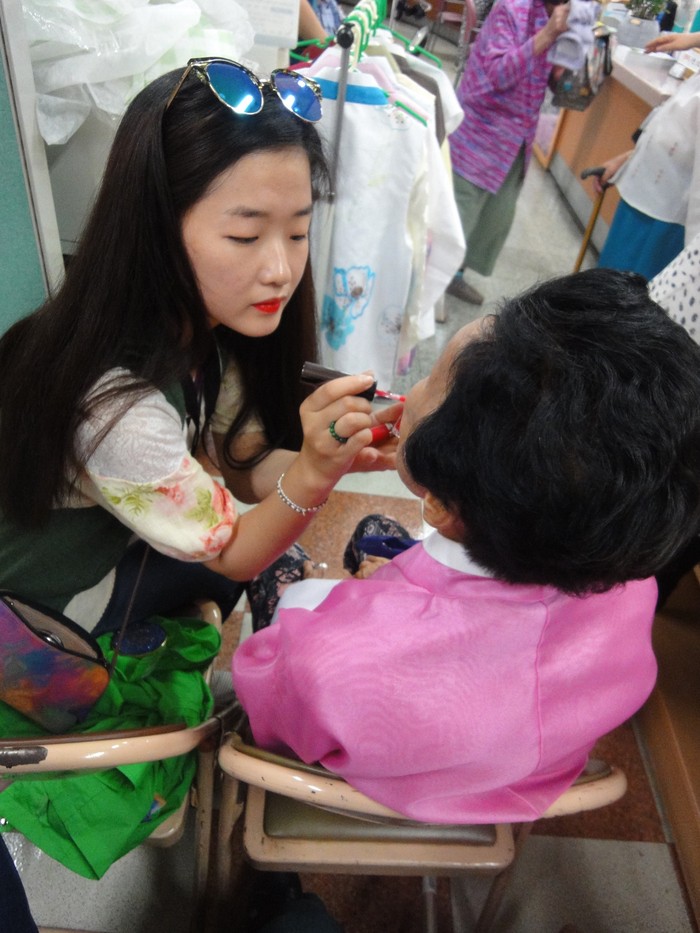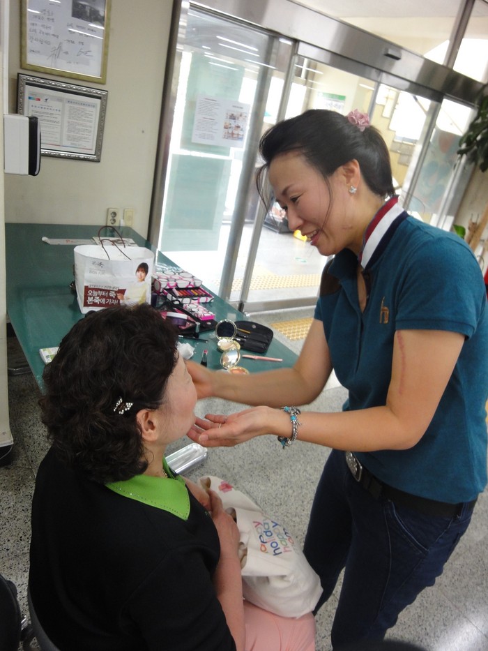| ▲ 자원봉사자 양혜정씨가 어르신들에게 메이컵업을 해 주고 있다. |