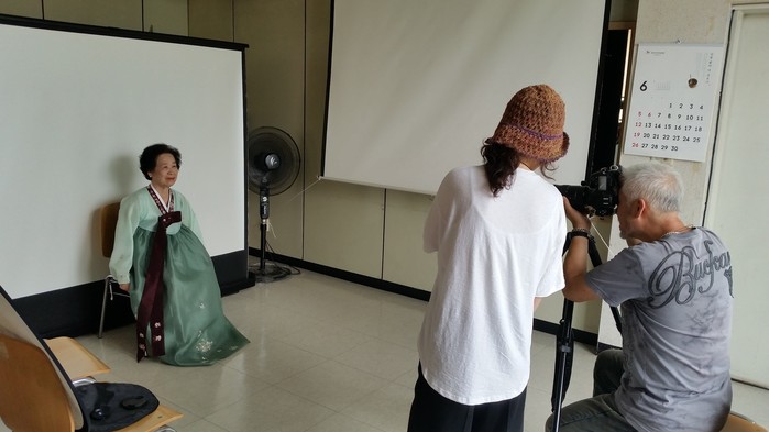 시간이 다 됐다. 자원봉사자와 소사동주민센터 직원들이 일사분란하게 움직인다. 소사동주민센터 한 켠에 촬영 장소가 마련된다. 소사동주민센터 박삼채 복지팀장은 한 명씩 호명하며 어르신들을 챙긴다. 이날 모인 어르신은 모두 55명. 한복을 차려입고 화장도 한다. 예쁘다. 가방에 고운 빛깔 한복을 챙겨온 어르신도 있다.