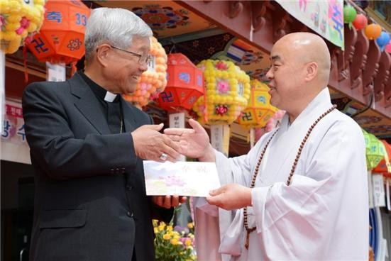 | ▲ 지난 5월 3일 부처님오신날을 맞아 천주교 대전교구장 유흥식 주교가 천태종 광수사 주지 무원스님을 방문해 반갑게 악수하는 모습. |