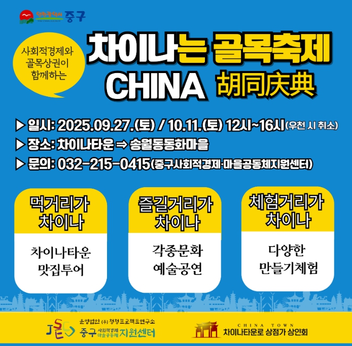 올해 행사는 중구 사회적경제·마을공동체 지원센터, 차이나타운로 상인회와의 협업으로 9월 27일, 10월 11일, 11월 1일 총 3회에 걸쳐 진행될 예정이다. 행사 시간은 정오(12시)부터 오후 4시까지다.