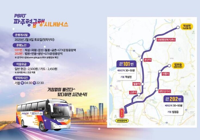 파주시가 내놓은 해법은 신도시와 구도심의 주요 거점을 연결하는 파주형 간선급행시내버스(PBRT, Paju Bus Rapid Transit)다. 올해 2월 개통한 파주형 간선급행시내버스는 적성‧문산 권역과 법원‧광탄 권역에서 신도시 내 지티엑스(GTX) 운정중앙역을 연계하는 두 개 노선으로, 3~5개 정류장만 경유해 이동시간을 30분 이내로 단축했다. 이 중 적성‧문산권 노선은 경의중앙선 3개 역(문산, 월롱, 금촌)에도 정차해 지티엑스(GTX) 뿐만 아니라 경의중앙선과의 접근성도 향상시켰다.