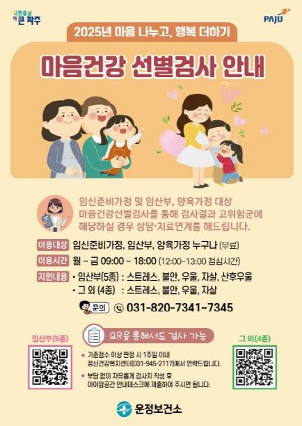 이용 대상은 임신준비가정, 임산부, 양육가정 누구나 가능하며, 운정보건소 1층 ’아이맘 공간‘에서 주중 9:00~18:00(점심시간, 공휴일 제외)에 검사할 수 있으며, 정보무늬(QR코드)를 활용한 온라인 검사도 가능하다.