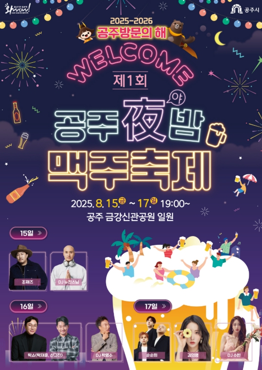 8월 15일부터 17일까지 3일간 열리는 이번 축제는 매일 오후 7시부터 밤 10시까지 운영되며, 공주시의 로컬 맥주와 전통주, 다양한 먹거리, 공연 프로그램이 어우러져 관람객에게 특별한 경험을 선사할 예정이다.