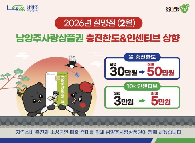 [세계로컬타임즈] 남양주시는 설 명절을 맞아 2월 한 달간 남양주사랑상품권(지역화폐) 인센티브 혜택을 확대 운영한다고 26일 밝혔다.