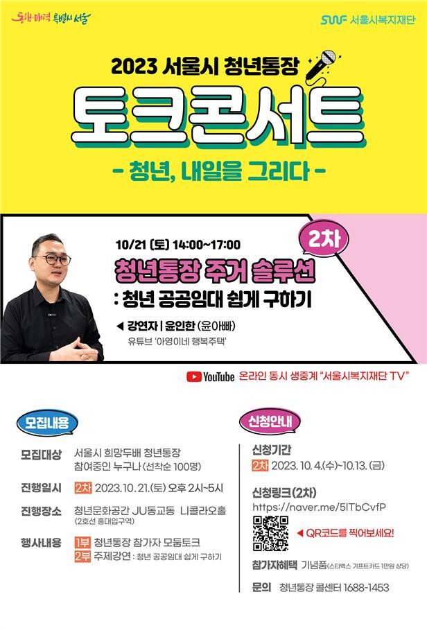 2부 ‘주제특강’은 유튜브에서 공공주택 전문 채널 ‘아영이네 행복주택’을 운영하는 윤인한 씨가 ‘청년통장 주거 솔루션 : 청년 공공임대 쉽게 구하기’를 주제로 강연과 실습을 진행한다. 가상의 서울시 청년 A가 어떤 공공임대 주택 입주를 신청할 수 있는지 알아가는 참여형 실습 방식으로 진행될 예정이다.