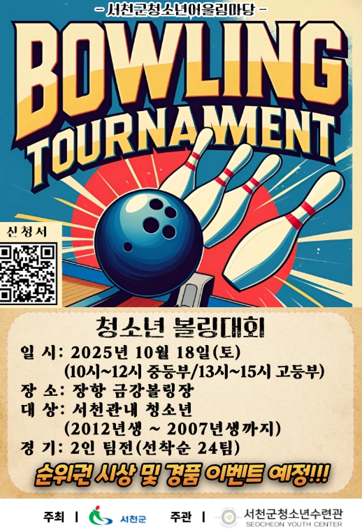 서천군이 주최하고 서천군청소년수련관이 주관하는 볼링대회는 작년의 수요를 바탕으로 올해 2회차를 맞이했으며 관내 중·고등학교 연령 청소년을 대상으로 장항 금강볼링장에서 진행될 예정이다.