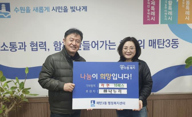 이에 김병목 매탄3동장은 “매년 잊지 않고 지역사회를 향한 깊은 애정과 관심을 보여주시는 ㈜나누리에 진심으로 감사드린다”며, “오랜 시간 꾸준히 이어온 상인과 기업들의 소중한 정성이 우리 이웃들에게는 큰 힘과 위로가 되고 있다”고 인사를 전했다.