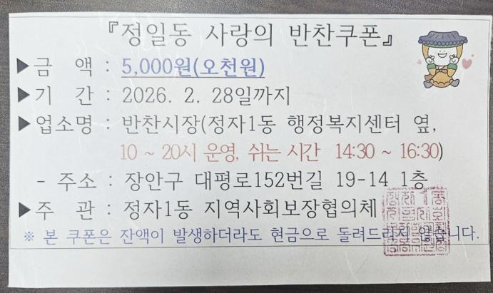 정자1동 지역사회보장협의체는 매월 캠페인 활동과 협의체 회의를 통해 취약계층 가구를 발굴하고 반찬 쿠폰을 지급함으로써 경제적 부담을 덜어주고자 한다. 반찬 쿠폰은 지난해 12월 ‘사랑 나눔 가게’로 선정된 반찬 시장 반찬가게에서 사용이 가능하다.