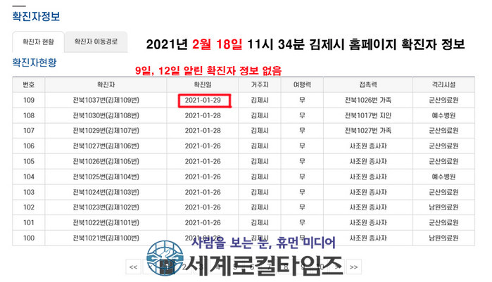 김제시는 지난 9일(전북 #1062)과 12일, 안전재난문자를 통해 두명의 확진자 발생을 알렸다. 그런데 18일 현재 김제시 홈페이지 코로나19 확진자 현황에서 이 두 확진자의 정보는 전혀 찾아볼 수 없다. 9일 확진자 발생 재난안전문자를 받은지 열흘째다.