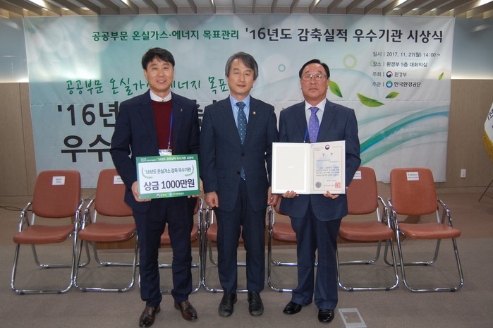 그간 환경문제와 에너지 절약 방안 등 꾸준하고 지속적인 관심을 갖고 실천해 온 결과 국가정책에 부응하는 온실가스·에너지 목표관리를 수행하고 감축율 36.3%를 달성해 전국 지방공사·공단 중 가장 뛰어난 이행 성과를 거둔 점이 인정돼 환경부장관상을 받게 됐다.