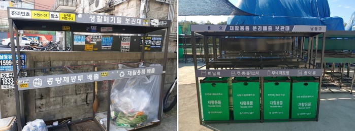 | ▲ 재활용 분리배출 보관대 정비 전(왼쪽) 후 모습. (사진=남동구 제공) |