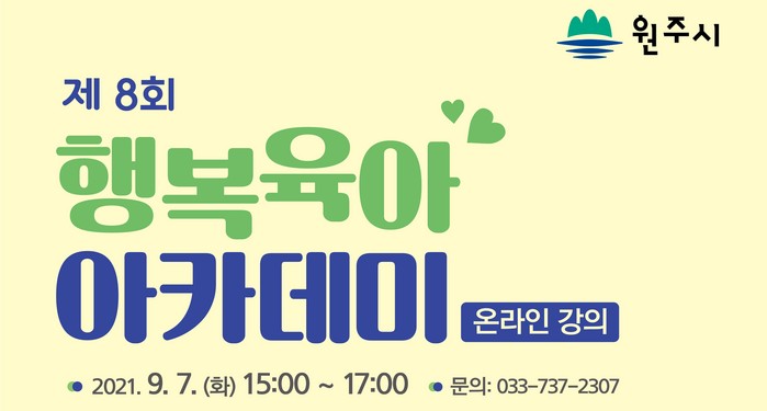 18일 원주시에 따르면 ‘제8회 행복 육아 아카데미’는 오는 9월 7일 오후 줌(ZOOM)과 원주시청 유튜브 채널을 통해 비대면으로 진행된다.