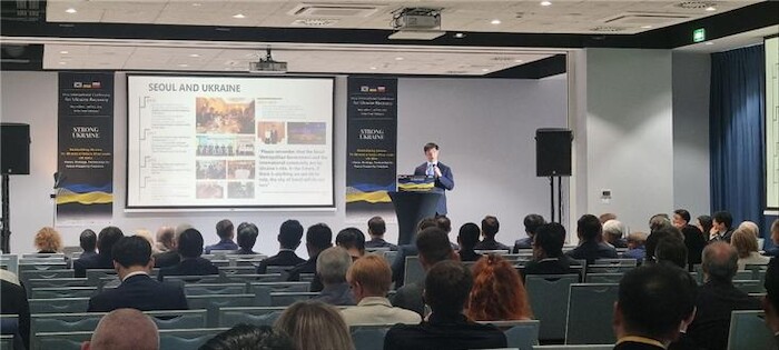 | ▲ 서울주택도시공사 정책수출사업단 관계자가 폴란드 바르샤바 국제 컨퍼런스에서 우크라이나의 인프라 재건협력 방안을 발표하고 있다. (사진=서울시) |